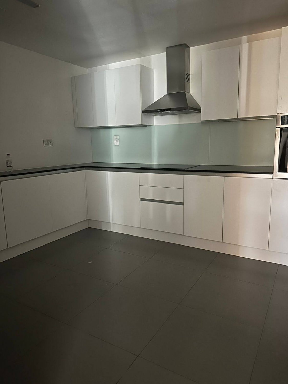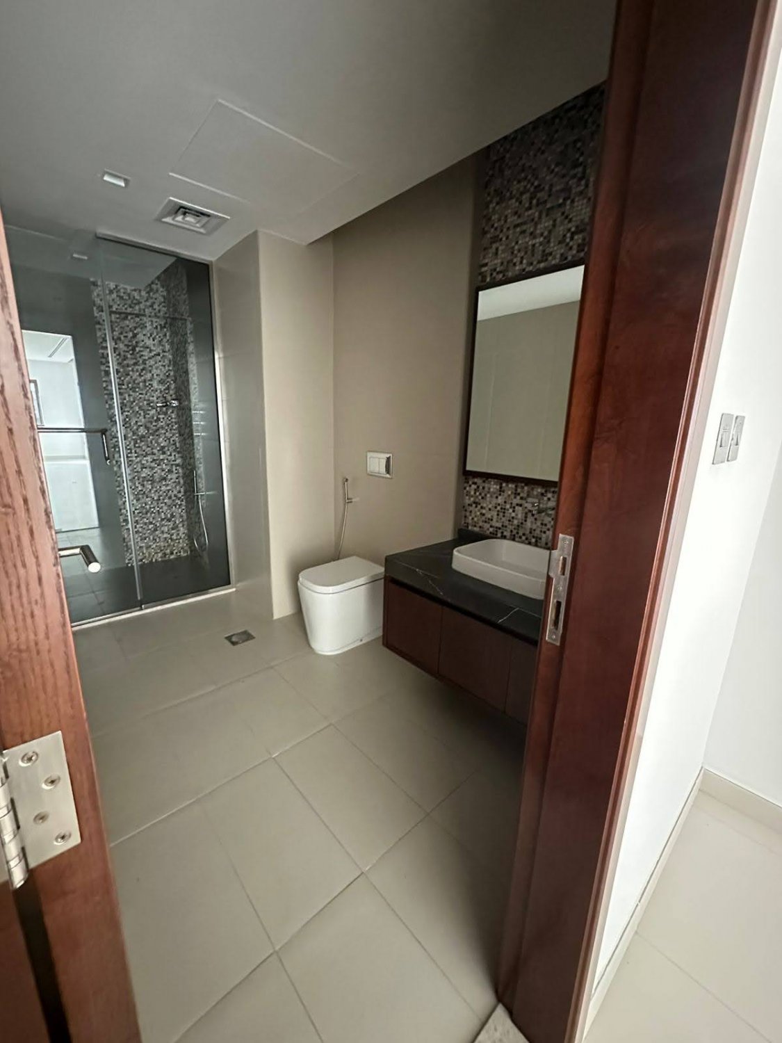 Located in debai’s Palm Jumeirah area, this 3-bedroom apartment boasts a spacious 346 m2 layout that captures attention. Its modern architecture and stylish interior design create a comfortable living space. The bright and expansive rooms are furnished with high-quality materials. A functional walk-in closet stands out, featuring derk brown wooden cabinets with large metal handles, giving a contemporary look. The light-colored flooring enhances the room’s spaciousness, while the minimalist design adds a sleek touch.