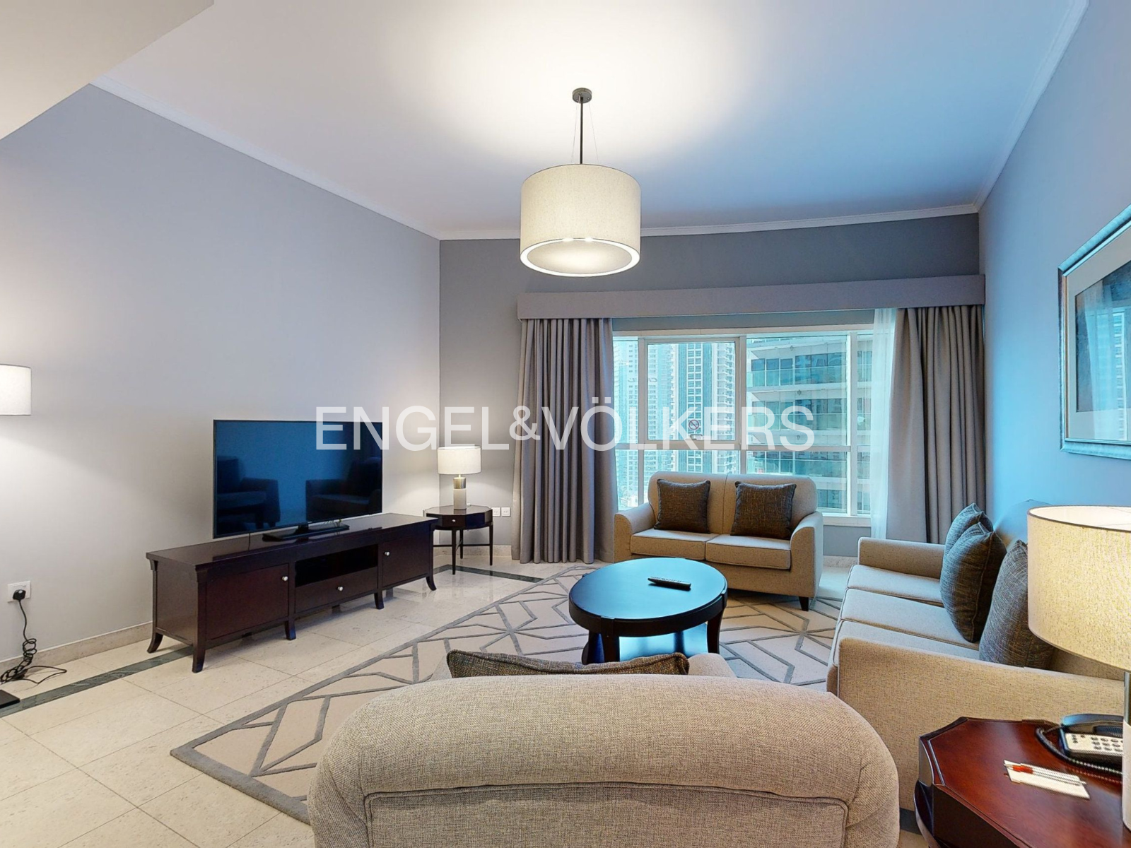 This 2-bedroom apartment stands out with its modern and stylish design, offering a breathtaking view of Dubai Marina. Spanning 160 m2, the spacious layout is meticulously planned, with large windows providing a stunning sea view from the open and airy living room. The living area is furnished with a large flat-screen TV and a comfortable seating arrangement, creating a relaxing environment. The apartment is fully furnished, with each room arranged in a functional and elegant way.