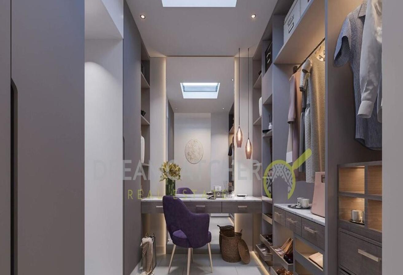 This 4-bedroom villa in the Tilal Al Ghaf area stands out with its elegant design and modern living spaces. Covering an area of 453.08 m2, the villa is built with every detail in mind to ensure comfortable living. Inside, a spacious living room features a cozy sofa, coffee table, and television area, combining style and functionality. Additionally, the villa offers a large walk-in closet and built-in cabinets for ample storage.